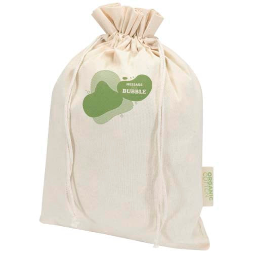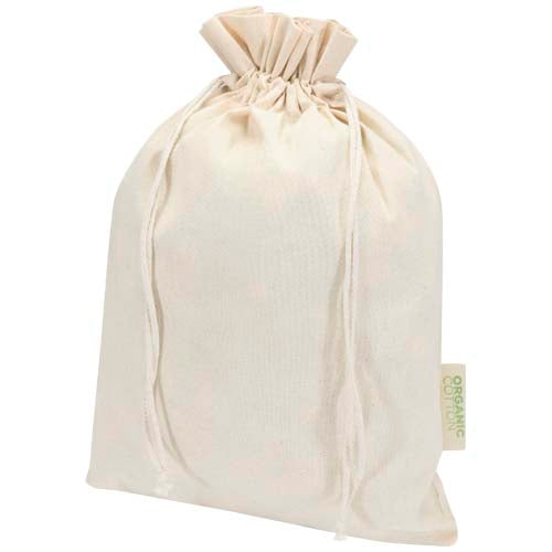 Gift bag made of 100% OCS certified 140 g/m² organic cotton featuring a cotton drawstring closure. Ideal for gifting or storing items. Size: 42 x 30 cm.