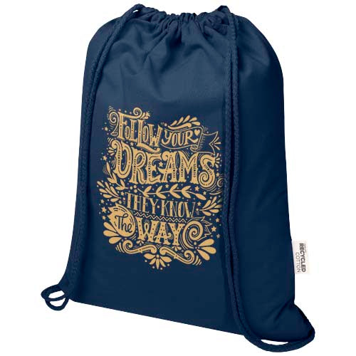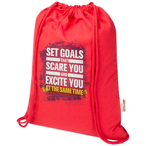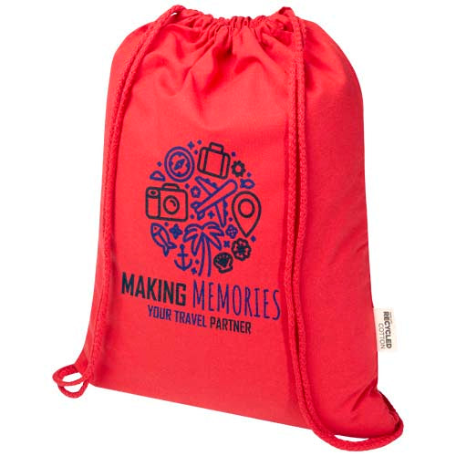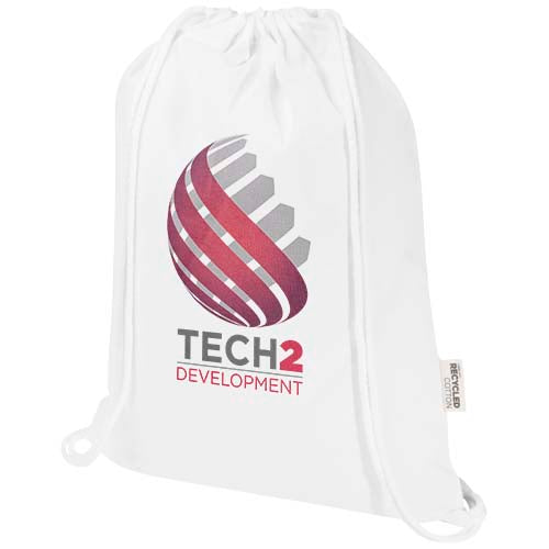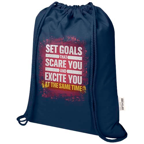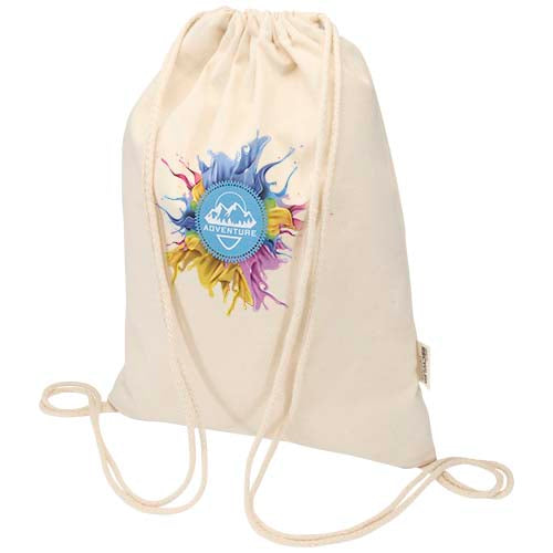 The Peru Blend drawstring bag is made from 60% GRS certified recycled cotton and 40% GRS certified RPET, making it a strong yet lightweight option for everyday use. Easy to carry on the back or shoulder, it features a large main compartment with a cotton drawstring closure that allows quick opening and closing. With 180 g/m² fabric, the bag is durable and offers plenty of space for adding a logo or message, making it ideal as a giveaway to promote your brand or campaign. The print methods available for this bag are also GRS certified, ensuring a transparent and fully certified supply chain. The bag can hold up to 5 kilos weight.