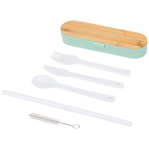 A reusable cutlery set including a fork, knife, spoon, straw, and straw cleaner – ideal for meals on the go. Compact and easy to clean, it’s perfect for lunch boxes, travel, or office use. Delivered in a plastic storage box with a bamboo lid.