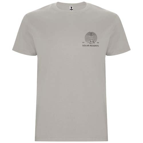 Tubular short-sleeved t-shirt in adult sizes and with side seams in kid's sizes. 1x1 ribbed round neck. Taped neckline in matching fabric.